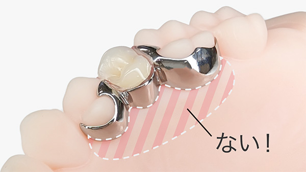 ブリッジのように歯を削る必要が無いのは勿論のこと、入れ歯特有の発音の妨げになる部分が存在しない為、異物感を感じにくい作りです。また、金属のバネがなく目立ちにくいのも特徴です。