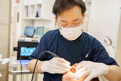 歯周ポケット内のプラークや歯石を徹底的に除去し、歯肉の健康を取り戻すための根本治療です。歯周ポケット4mm以上の箇所は浸潤麻酔科をほどこした上で、ブルーラジカルP-01による治療を行います。最深部の基底部に存在するプラークを殺菌することで、歯周ポケットを非外科治療で5mm以下に減少させることを目指します。