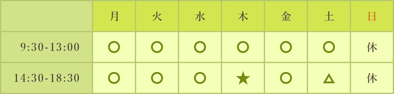 月火水金 14:30~18:30 最終受付 18:00 木 9:30~13:00 最終受付 12:30 木 14:30~20:00 最終受付 19:30 ※矯正歯科のみ 土 9:30~13:00 最終受付 12:30 土 14:30~18:00 最終受付 17:30 |